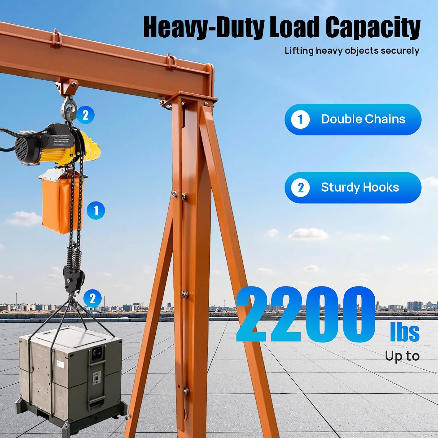 SpecificationsHousing Material: Aluminum AlloyChain Material: 20Mn2Hook Material: Manganese SteelRated Voltage: 110VRated Power: 1500WType: Double ChainsMotor Protection Grade: IP55Insulation Class: FChain Diameter: 6.3mm/0.25inchMotor Type: Pure Copper MotorPlug Type: American Standard Maximum Load Capacity: 1T/2200lbsLifting Speed: 4m/min (13ft/min) Lifting Height: 4m/13ftHandle Switch Wire Length: 3m/10ftGross Weight: 28kg/61lbsPackage Size: 51*28.5*39cm/20.9*11.22*15.35inchMachine Body Size (L*H): 45*15cm/17.72*5.91inchPackage Included1* Electric Chain Hoist1* Lifting Strap1* Chain Bag1* English Manual1* English Inspection CertificateNotes1. If the specified object is too large or the object cannot be hung directly on the hook, you will need to tie a longer webbing around the object and then hook the webbing with the hook to lift the object.2. Please ensure that all persons in the immediate area are informed and warned of the need for safety before lifting and moving heavy objects. 3. Please do not leave lifted heavy objects unsupervised for long periods as this may cause injury.4. The lifting weight shall not exceed the maximum load capacity of the product (Single chain weighing up to 1100 lbs, double chain weighing up to 2200 lbs).5. Please do not use the chain when it is bent or twisted. 6. Please do not throw the product to avoid damage.7. For the uniformly distributed work cycle, the maximum operation time of the hoist per hour is 25%, and it can handle up to 150 starts per hour. When used for infrequent working hours, it can run for 30 minutes from the cold start, with a maximum of 200 starts per hour.8. Before using the machine, please read carefully all the safety instructions in the product manual.