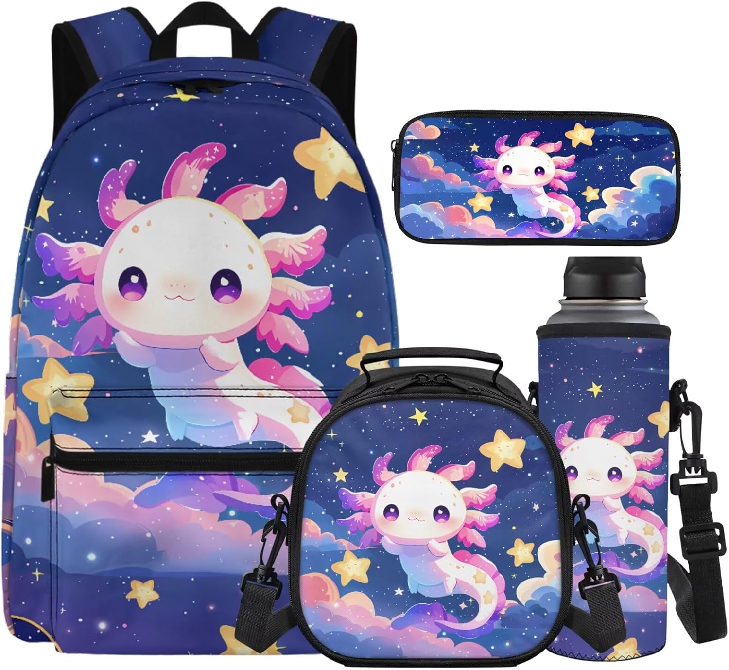4-in-1 Kids Backpack and Lunch Box Set Size: Backpack: 17.3 (L) x 13 (W) x 7 (H) inches; Lunch Bag: 8.66 (L) x 8.26 (W) x 5.11 (H) inches; Water Bottle Sleeve: 10.2 (L) x 3.8 (W) inches; Pencil Case: 8.2 (L) x 3.9 (W) inches. Material: Premium polyester fabric, lightweight and heavy duty. Multiple Pockets: Backpack has a spacious main pocket, 1 zippered front pocket and 1 side pocket; Lunch Bag has an insulated main compartment with zipper closure; Water bottle sleeve fits 500ml/750ml/1000ml cup. Pencil Case has an open-top design with multiple slots for easy access. Ideal for school, everyday, travel, short trips or other occasions. Featuring padded shoulder straps and a breathable back panel, this ergonomic backpack provides comfort and support. With a large capacity and fun print design, this set is versatile and practical for school, travel, and daily adventures. Upgrade your child's school gear with this durable and stylish backpack set today.