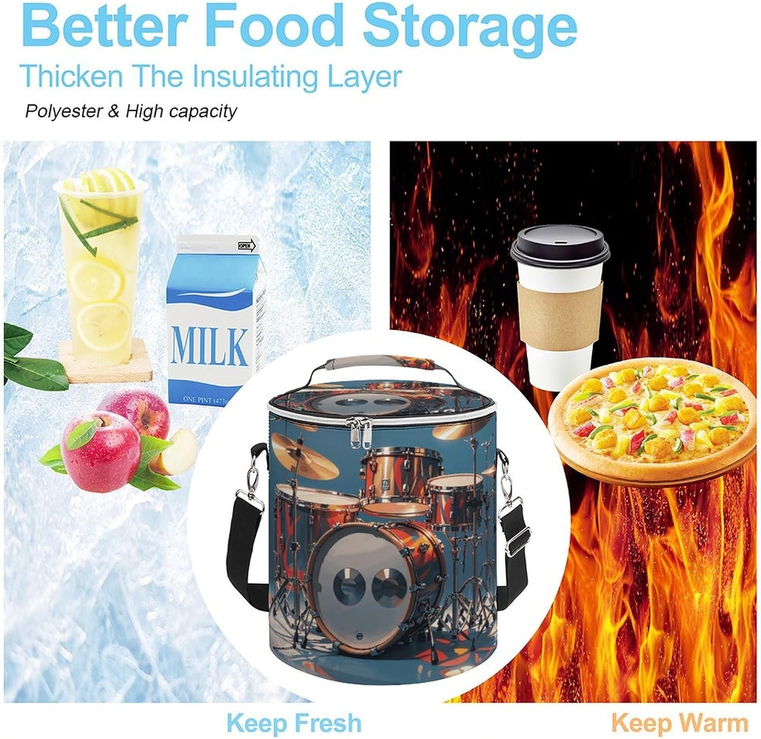 Keep Your Adventures Fresh and Mess-Free!Our Cool Drum Set Picnic Basket is designed to elevate your outdoor experiences. Whether you're planning a family picnic, a day at the beach, or a long camping trip, this bag ensures your food stays cold, your drinks chilled, and your belongings organized without any leaks.KEEPS THINGS COLD & INSULATEDConstructed with high-quality polyester and advanced insulation technology, this bag provides excellent thermal retention to protect your perishables.UNMATCHED PERFORMANCEThe leakproof design means you never have to worry about dealing with watery messes from melting ice packs again. The large, wide-opening top makes loading and unloading a breeze, and the heavy-duty zipper secures everything inside.COMFORT AND PORTABILITYWe've equipped this Cool Drum Set cooler bag with an adjustable shoulder strap to distribute weight evenly and reduce strain, even when the bag is fully loaded. The additional padded top handle offers a comfortable alternative for carrying.READY FOR ANYTHINGYour ultimate partner for adventure, this versatile tote is suited for a wide range of activities: camping, hiking, beach trips, barbecues, road trips, and daily grocery shopping. It's also a smart addition to your car emergency kit or disaster preparedness supplies.EASY TO STORE AND MAINTAINWhen not in use, its collapsible design allows for compact storage, saving precious space in your car or closet. To keep your cooler bag in great condition, we recommend hand washing or machine washing with mild detergent. Do not bleach or soak for extended periods. Allow to air dry thoroughly before storing.Size:10 x 11.8 inches / 25.5 x 30cmI wish you a pleasant shopping experience!