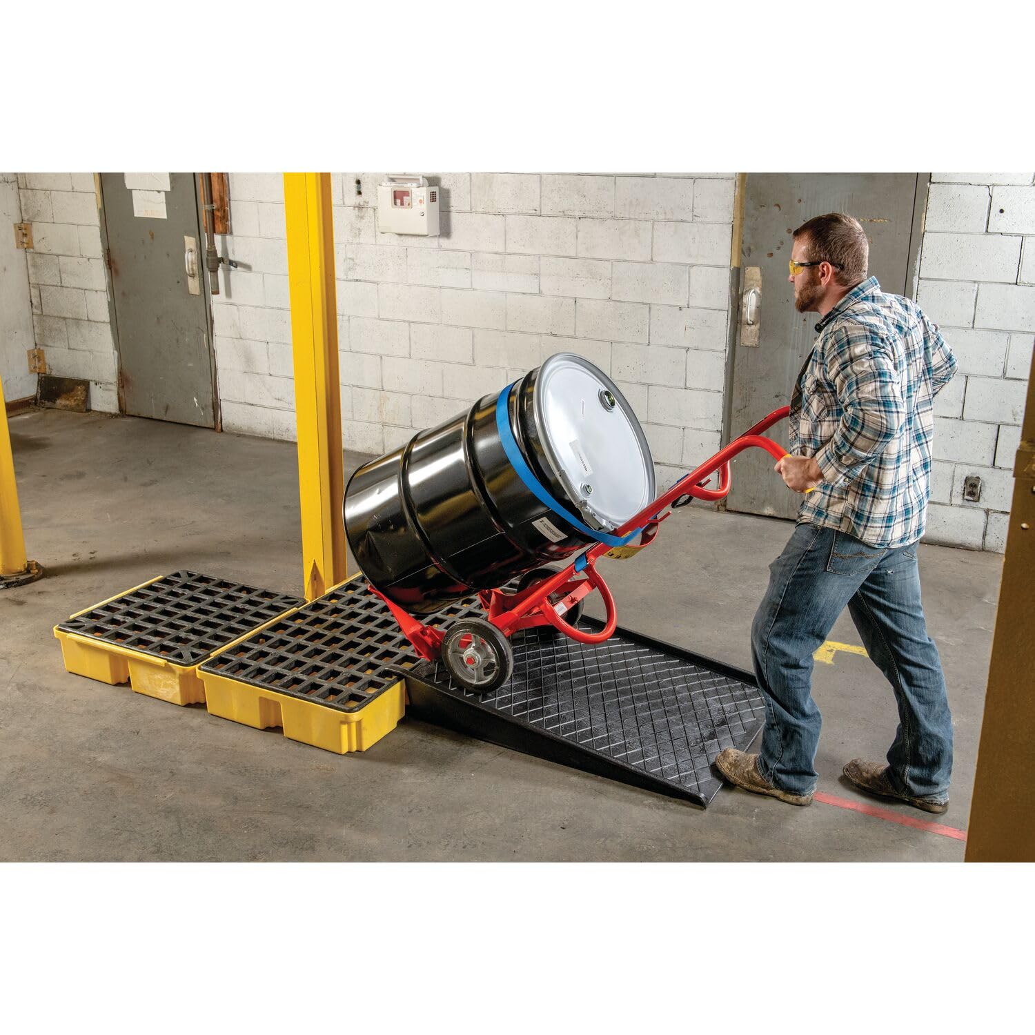 Looking for a product that can help you contain spills and avoid potential fines? Look no further than Eagle modular spill platforms. Constructed with durable high-density polyethylene (HDPE), this line of spill containment platforms offers superior protection against spills, while its seamless construction eliminates the risk of leaks, providing you with peace of mind. Every modular spill platform has built-in U-channels that allow for easy connection of multiple platforms giving you the flexibility you need in drum filling and dispensing and allowing you to create a customized spill control system based on your needs. With a low-profile design, each platform measures 6.5" high, making it easy to handle drums and ensuring a safe and efficient workflow. For added convenience, most platforms in this line feature forklift pockets that make relocation simple. The removable grating allows for easy cleaning and maintenance, ensuring long-lasting durability. This spill containment platform is EPA compliant and supports SPCC (Spill Prevention, Control, and Countermeasure) regulations, ensuring you meet the necessary environmental standards. Most products in this line are available with or without a drain in yellow or black and are compatible with a ramp (1689 or 1689B). Don't take chances with your spill containment needs. Choose a US-made chemical spill containment solution by Eagle Manufacturing to ensure your facility is safe and compliant. Get yours today and experience peace of mind knowing that your spills are contained and your drums are protected.