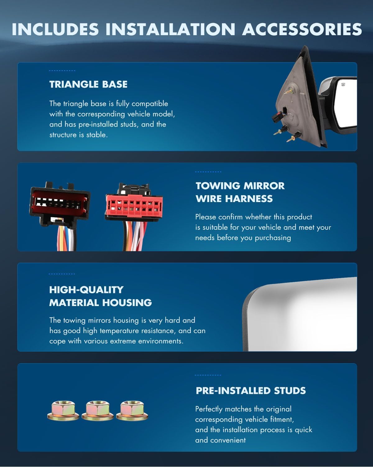 | Other Special Features of the Product | Manual folding and telescoping,heated,Turn Signal light,Puddle light with Chrome Housing |