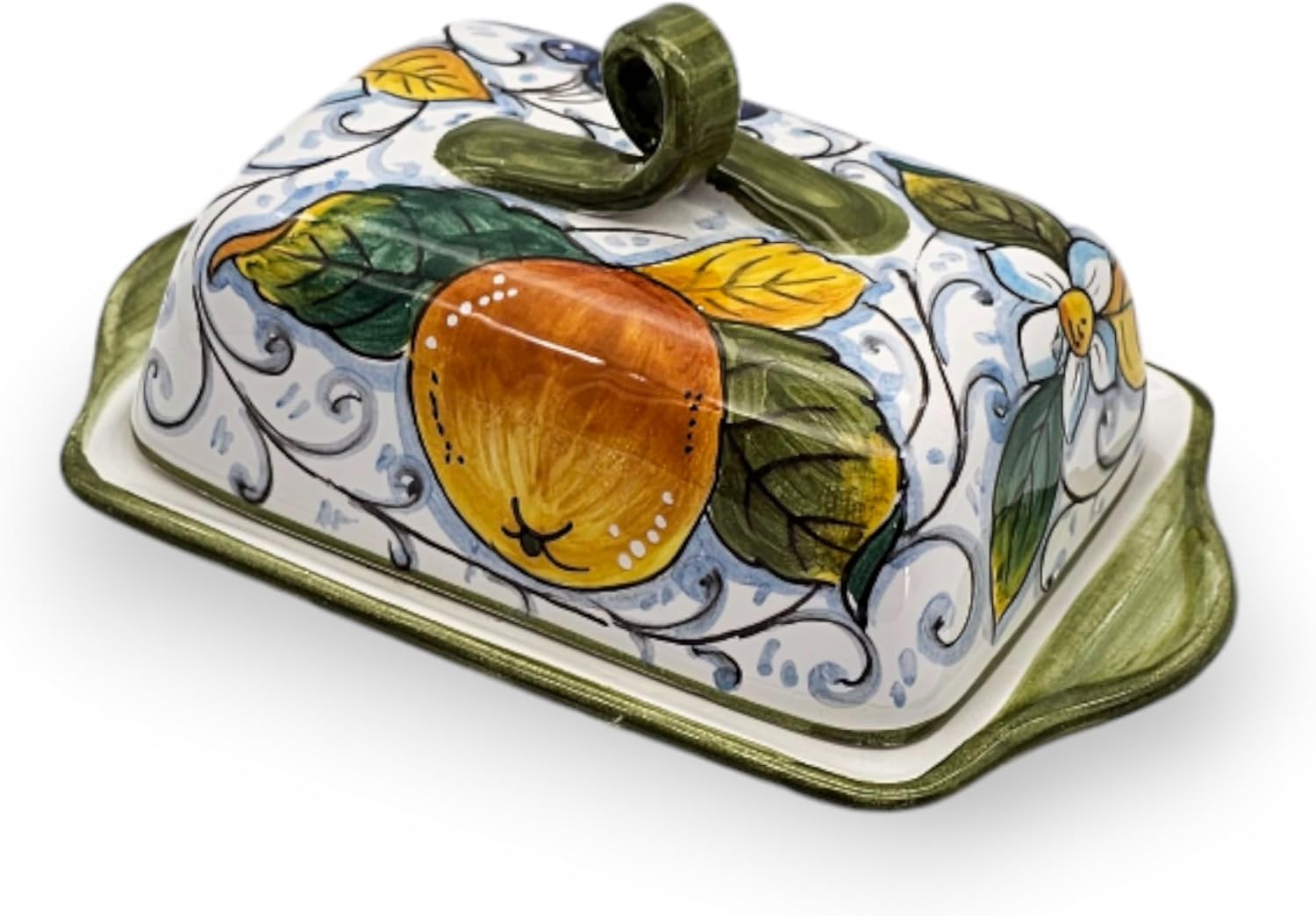 This stylish tuscan butter dish with lid for countertop in Mix Fruits Design for kitchen brings Italy to your home . Ceramic multi color Butter container is hand painted With Mix Fruits Design. Tuscan decor easily creates the classic chic look for home kitchen, bistro, restaurant. Coordinate with other Tuscany kitchen decor or create nice ambiance when serving any Italian meal..✔This italian Butter dispenser is made by hand in Tuscany - Italy.The hand painted covered butter dish is 8,26 inch x 5,11 inches . This Mix Fruits Design kitchen accessories is made with material with a high quality finish gloss that not only looks stylish but can be used for kitchen..✔Perfect for parties and entertaining, or everyday use!, this multi-colored Ceramic tuscan dinnerware.✔This cheese container for fridge is ceramic is hand-painted in Italy, It serves as both a decorative ceramic as well as a functional kitchen accessory making it a great gift for any home✔This butter holder for counter is essential for kitchen or restaurant. The colorful top is also suitable as a decorative object on any shelf✔Top Quality: High quality ceramic Our Tuscany kitchen accessories are handed painted..✔Great Gift: for those that love Italian kitchen decor. Give as Mother's day, birthday, holidays, Christmas, wedding, housewarming and hostess gifts, perfect to include in a gift basket. Or buy for your kitchen...These vibrant designs will maintain their color. Dishwasher, microwave and food safe.Giotti Ceramiche - Florence Italy -