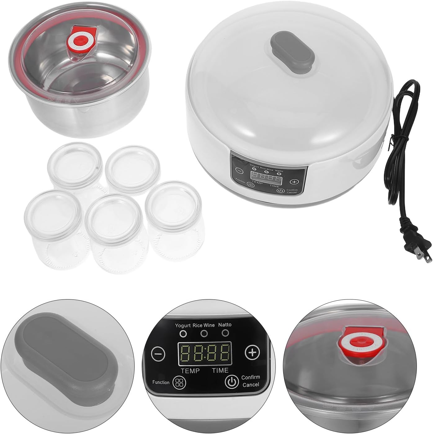 Package List 1 x yogurt machine (including power cord) 1 x instruction manual 5 x bottles 100ml Characteristics - Size: 15.00X15.00X8.50cm/5.89X5.89X3.34in -It's for beginners: simple operation and clear instructions make this yogurt maker ideal for those new to yogurt making yoghurt maker - Size: 21.00X21.00X13.00cm/8.25X8.25X5.11in -36hour timer: the extended timer feature allows for flexible fermentation times, catering to your schedule automatic yogurt machine -Large capacity: the 1.2 l capacity is for making enough yogurt for the entire family automatic yogurt maker machine -Material:Stainless steel, Silicone, Rubber, Copper, ABS, Glass - Size: 7.00X5.50X5.50cm/2.75X2.16X2.16in -Easytoread lcd: the lcd display provides clear and intuitive information on the yogurtmaking process yogurt maker machine for student -Product Info: Yogurt maker -Accurate temperature control: achieve fermentation with precise temperature settings, ensuring consistently great yogurt greek yoghurt maker -Color:WhiteGoods Informationyogurt maker kit This yogurt maker is for home use, offering a simple way to create fresh, yogurt.stainless steel yogurt machine Its versatility supports a variety of recipes, from classic yogurt to -style creations.automatic yogurt machine The LCD display provides clear feedback on the fermentation process, while the compact design saves counter space