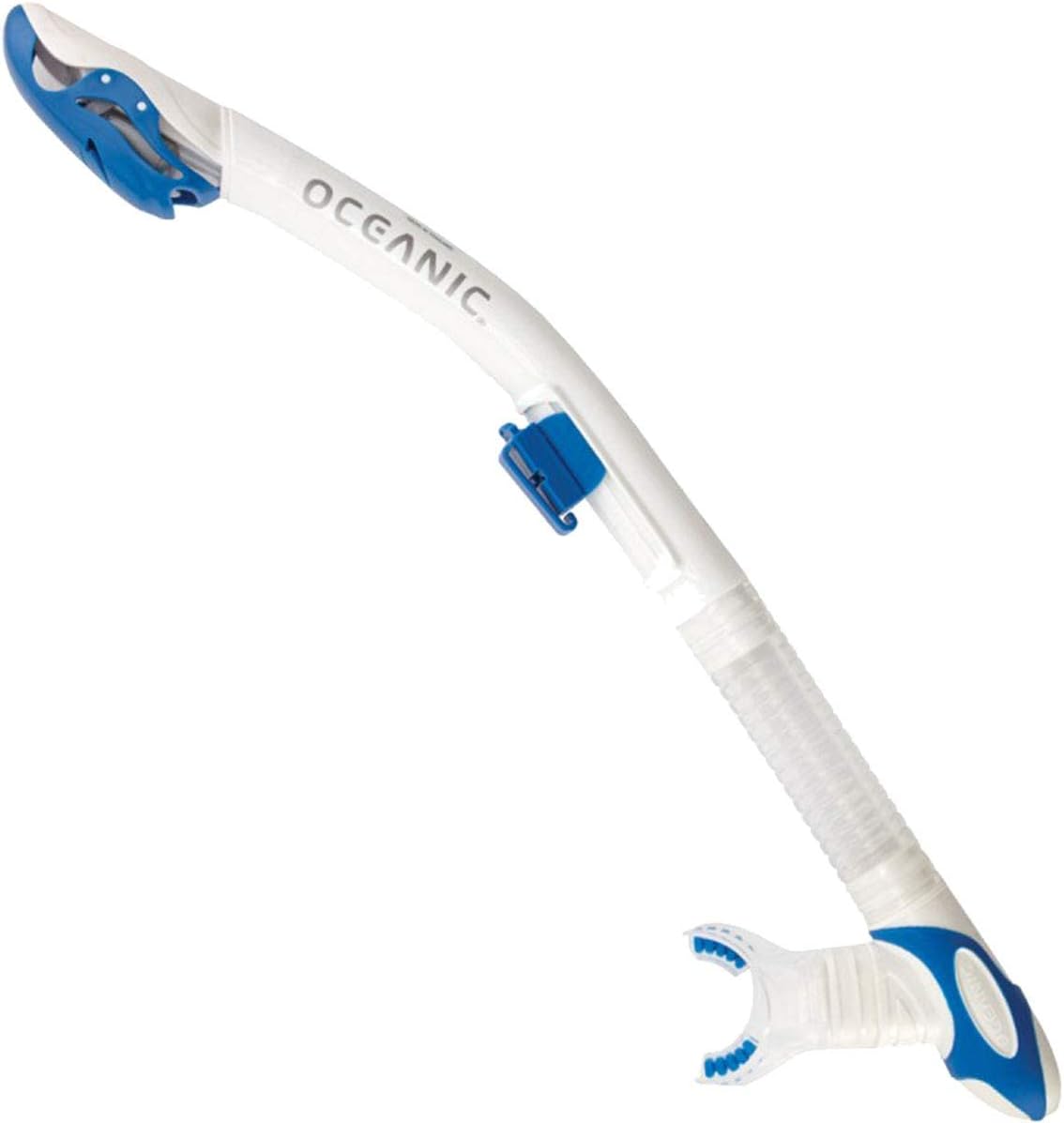 Introducing the Oceanic Ultra-Dry Snorkel, a snorkel that stays as dry as a desert, even when you're exploring underwater depths. Leveraging Oceanic's patented dry snorkel technology, the Ultra-Dry ensures no unwanted water enters the barrel while allowing easy airflow for effortless breathing.The Ultra-Dry is designed with ergonomics in mind, reducing resistance and drag as you move through the water. When not in use, its drop-away corrugated section keeps the snorkel out of your way, while also reducing jaw strain when you're snorkeling - it's all about enhancing your comfort.Are you someone who chews on their snorkel mouthpiece? Don't worry, the Ultra-Dry has got you covered. It comes equipped with a replaceable 100% liquid silicone rubber mouthpiece that feels just like a regulator. Extremely comfortable, it's built for hours of snorkeling fun.Quick and easy water drainage is provided by the one-way purge valve located below its mouthpiece, and the dual exhaust valves on the bottom ensure that any residual water is efficiently expelled. Best of all, it requires minimal effort from you. The Ultra-Dry Snorkel is also equipped with a "quick-lock" clip for swift attachment and detachment from your mask.