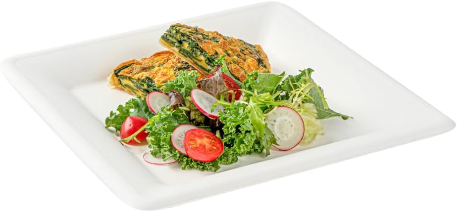Reduce your carbon footprint with our Pulp Safe No PFAS Added Square White Sugarcane / Bagasse Medium Plates. These bagasse plates prioritize customer reassurance by being manufactured without the addition of PFAS, making them safe for eating meals. Made from bagasse, a by-product of sugarcane processing, these sustainable plates are disposable in commercial waste management facilities. With a hot and cold accommodating design, these disposable plates can hold all types of foods without breaking. These freezable and microwavable bagasse plates are perfect for storing or reheating food. Featuring a white finish and a square shape, these disposable plates elevate the appeal of the food served on them. The extended rims of these pulp plates catch spills and make carrying them around easier. Measuring 7.9 inches long by 7.9 inches wide, these medium bagasse plates are ideal for serving medium-sized meals. Shipped in a 100 count box.
