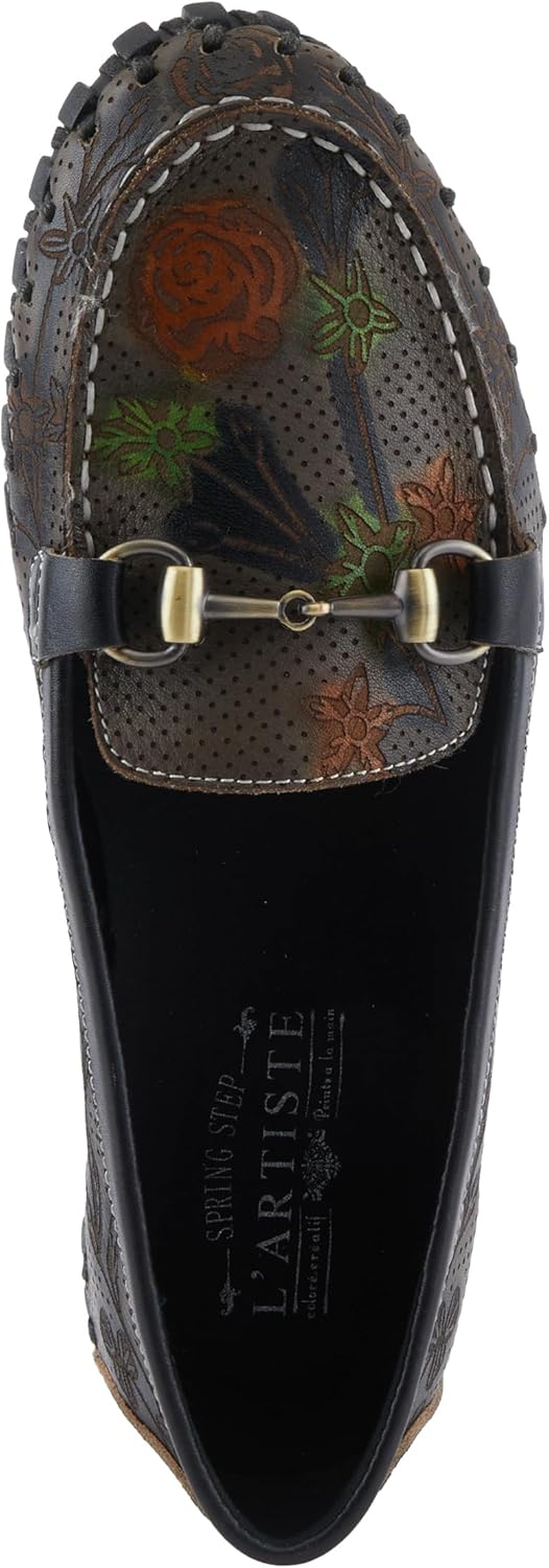 The DELAVIGNE is made for those who want comfort without sacrificing style. The supple flexibility helps reduce fatigue while the floral designs add a feminine touch of beauty to any outfit. With its delicate artwork and ultra-plush feel, the DELAVIGNE elevates your look while pampering your feet. Slip into this loafer when you want to treat yourself to long-lasting comfort and subtle sophistication. Cloud-like cushioning follows the natural shape of your foot. Handpainted floral designs add artisan elegance. Center gold bit for a touch of luxe. Flexible sole and upper move with your foot. Disclaimer: L’Artiste products are made with natural tanned leather using traditional hand painting techniques. This unique finishing process is used to create a natural effect with color variations to deliver authentic look and beauty.