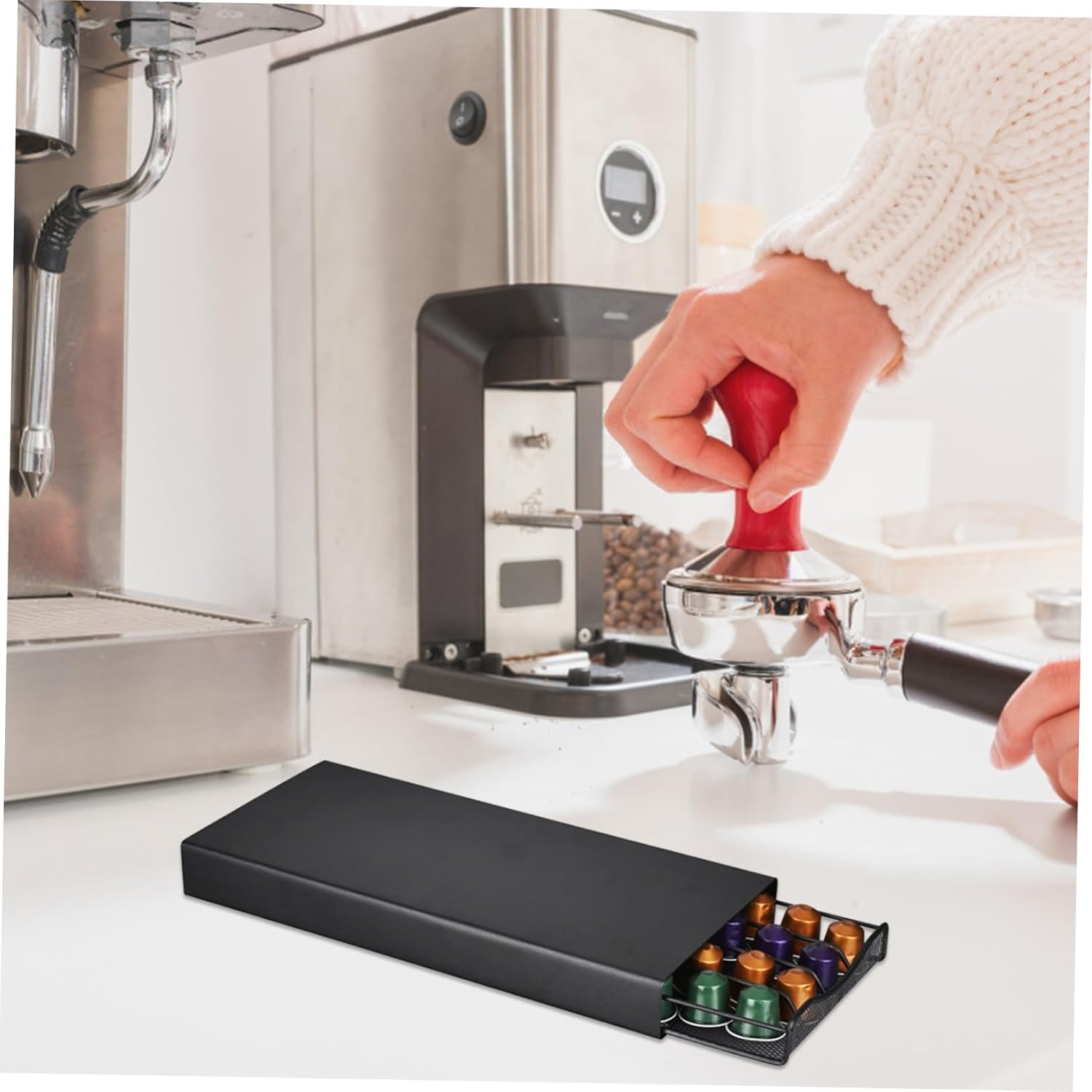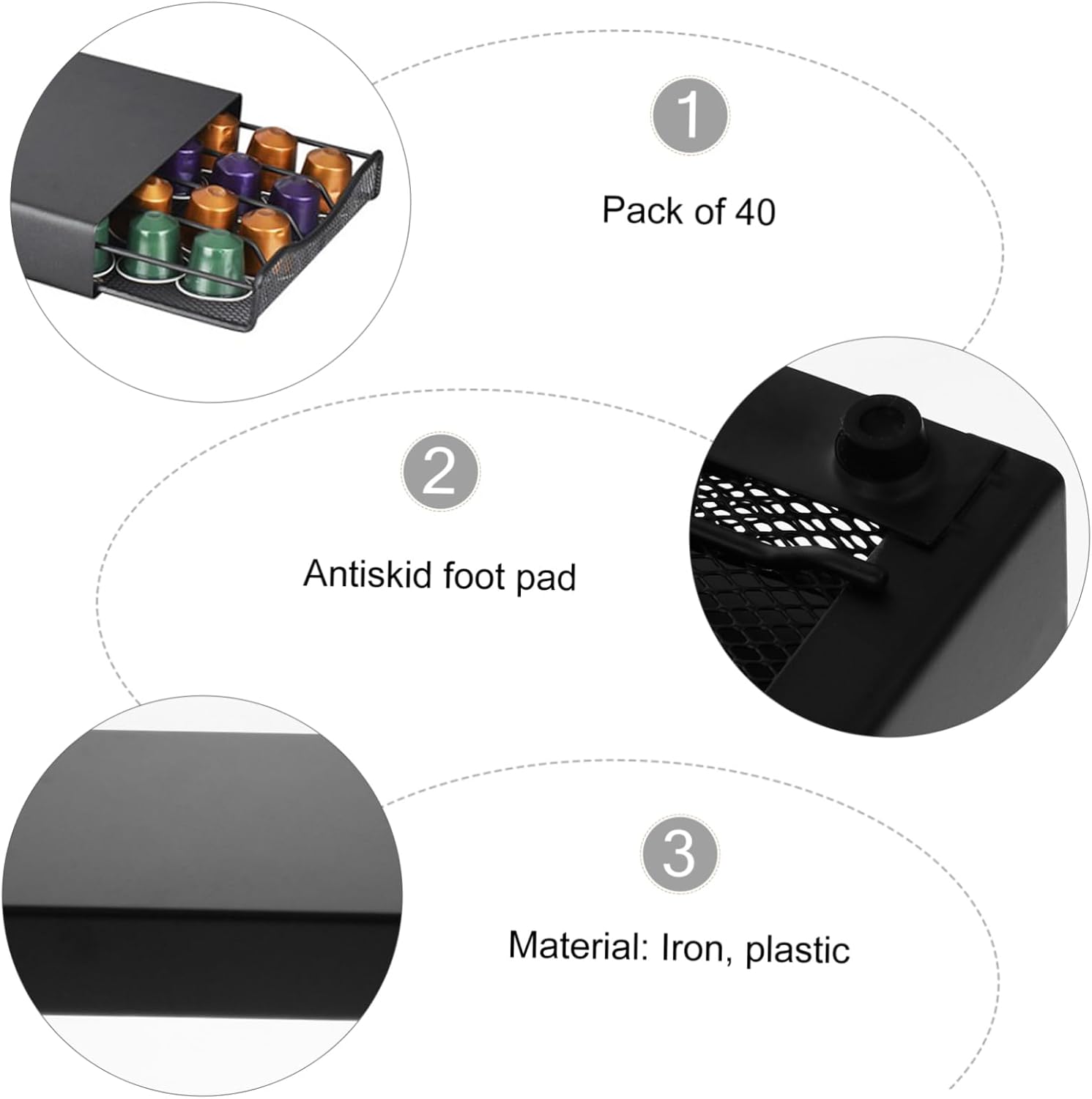 Package Include 1 x coffee capsule storage rack Characteristics -Color: Capsule Storage Rack -Material: Iron, plastic Metal Coffee Capsule Storage Box -Size: About 37.50X17.50X5.50cm/14.74X6.88X2.16inch Coffee Rack - It can hold 40 coffee capsules at a time Storage Container. - The excellent workmanship of our product will bring you a using experience Storage Box. - Easy to pull out the drawer smoothly Coffee Pod Rack. - The modern design of this coffee capsule holder well fits to scenes, such as kitchen, living room, etc Capsules Storage Case. - Made of material with stable performance and Storage Container for Coffee Capsules.Goods DescriptionCoffee Pod Rack This coffee capsule storage rack is made of iron and plastic materials for and to use.Coffee Capsule Storage Holder You can easily pick up your favorite flavor for the beautiful morning and relax with a delicious coffee.Coffee Capsule Storage Rack With drawer style design, easy to use