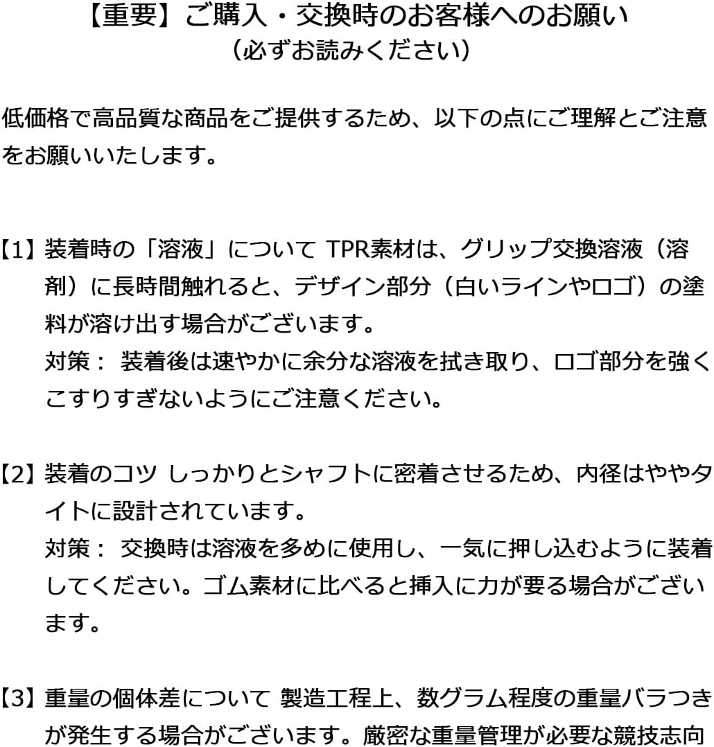 TPR Golf Grips Set of 8 Features: Features a moist fit. Surface hardening, not easy to deteriorate. Abrasion resistant *Clean stains with mild detergent Specifications: Material: T P R (teepear); Weight: 1.8 oz (50 g); Diameter: 2.2 oz (58 g). *Short for "T P R" = "Thermoplastic Rubber" Made of eco-friendly material with excellent heat resistance and does not release harmful substances even when burned. 8 pieces per pack (same color).