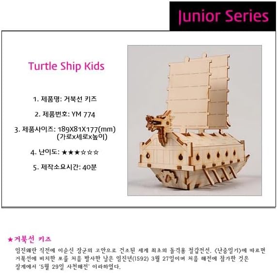Product Details 📏 Size: 189 x 81 x 177 mm (7.44 x 3.18 x 6.97 in) 🎁 Contents: Pre-cut wooden sheets, illustrated assembly guide 🛠️ Difficulty Level: ★★★★☆ (Intermediate–Advanced) ⏳ Assembly Time: Approximately 40 minutes 🌍 Origin: South Korea 📦 Material: Plywood (Laser-cut natural wood) Product Description 🐉 Recreate Korea’s Legendary Turtle Ship Experience the power and history of the world’s first ironclad warship, the Geobukseon (Turtle Ship), with this detailed wooden assembly kit inspired by Admiral Yi Sun-sin’s ingenious naval design. 🪵 Precision-Cut Natural Wood Craftsmanship Each piece is made from durable, eco-friendly plywood using laser cutting for a clean, accurate fit. Enjoy the authentic feel of natural wood with structural integrity and fine detail. 🎨 Customizable Appearance The raw wooden surface allows for endless creativity—paint, stain, or finish it to your personal taste to bring your Turtle Ship to life. 🧠 Educational & Cultural Learning Experience Build, learn, and appreciate Korean naval history while improving patience, problem-solving, and fine motor skills. Ideal for history enthusiasts, hobbyists, and model builders alike. 🎁 Perfect for Display or Gift-Giving Once assembled, the Turtle Ship becomes a striking display model that celebrates Korea’s maritime innovation—making it a meaningful gift or collector’s piece. Product Care / Warnings ⚠️ Not suitable for children under 14 – Contains small and fragile parts. ⚠️ Use wood glue for durable assembly (sold separately). ⚠️ Do not expose to high humidity or direct sunlight. ⚠️ Avoid excessive force – thin parts may break. ⚠️ Recommended for indoor use and display. Build a Masterpiece of Korean Naval History 🐉 Step into the legacy of Admiral Yi Sun-sin and recreate the legendary Turtle Ship with Youngmodeler’s wooden kit — a perfect balance of craftsmanship, culture, and creativity.